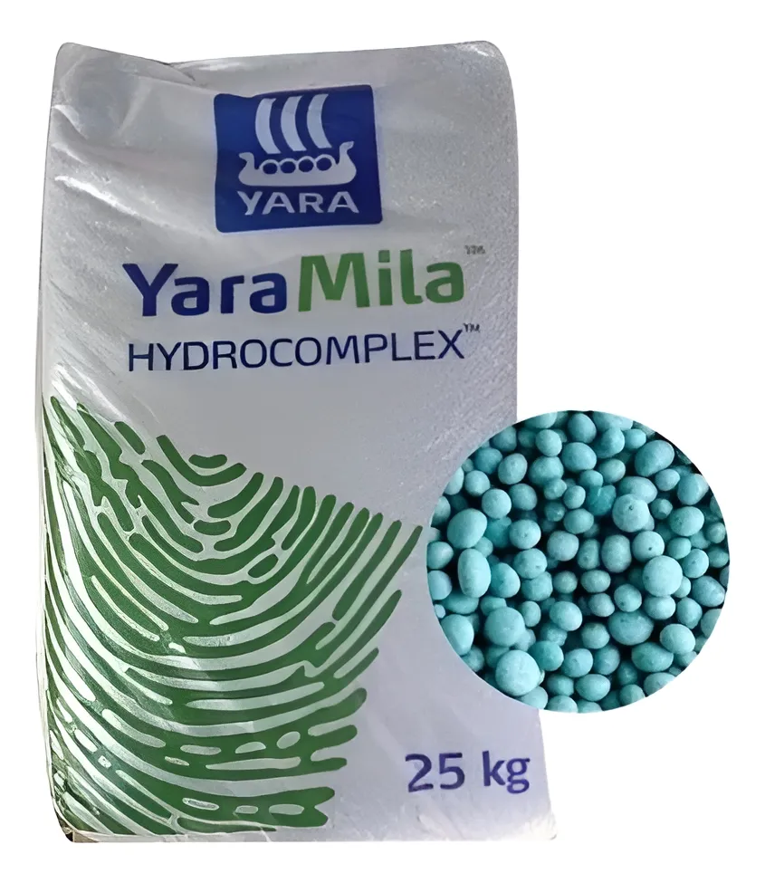 FERTILIZANTE YARA MILA HYDROCOMPLEX – NITROFOSKA AZUL X 25 KG YaraMila Hydrocomplex (12-11-18 + 3% MgO + 8% S) maximiza el rendimiento y la calidad del cultivo. Aporta macro y micronutrientes para aplicación en frutales y hortalizas. Por su contenido de nitrógeno en forma de nitrato y amonio, y fósforo como polifosfatos asegura su máximo aprovechamiento durante el ciclo del cultivo. Además aporta potasio a base de sulfato de potasio, libre de cloruro, lo cual permite su aplicación en cultivos sensibles. Por tratarse de una mezcla química ofrece una distribución pareja de los nutrientes en aplicaciones al voleo o con máquinas fertilizadoras con bajo riesgo de segregación de nutrientes durante el transporte, manipulación y aplicación. Es un fertilizante prilado altamente soluble, ideal por su rápida respuesta para cultivos de ciclo corto y/o altas demandas nutricionales. Es específico para césped, arboles (grandes y chicos), arbustos, canteros, macetas, flores, plantas en general, huertas, etc. COMPOSICION Nitrógeno (N) : 12 % Fósforo (P): 4,8 % Potasio (K): 15 % Calcio (Ca): 3 % Magnesio (Mg): 1.5 % Azufre (S): 8 % Hierro (fe) 0.2 % Contiene trazas de Boro Abono complejo NPK (Mg-S) 12-8-16 (3-25) con micronutrientes DOSIS DE APLICACION: Tipo de Cultivo // Dosis por aplicación Césped // 2 a 5 kg /100 m² Hortalizas // 3 a 5 kg / 100m² Arbustos chicos // 10 a 20 gr x arbusto Arbustos medianos // 40 a 50 gr x arbusto Arbustos grandes // 80 a 100 gr x arbusto Árboles chicos // 40 a 50 gr x árbol Árboles medianos // 250 a 300 gr x árbol Árboles grandes // 1 a 1.5 kg x árbol. ———————————————————————– SOMOS SINCACIQUE AGROPECUARIA RETIRO EN SUCURSAL PILAR Lun a Vie de 08:00 a 19:00 hs Sabados 09:00 a 14:00hs ENVÍOS Hacemos envíos a través de mercado envíos y Correo Argentino a todo el país